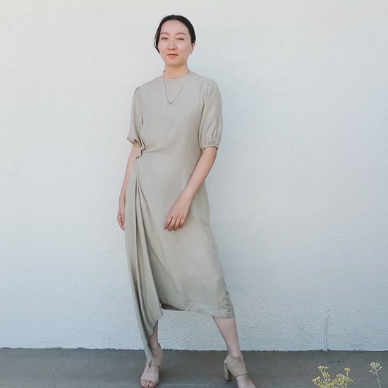 Gathered waist, puff sleeve, loose fit, satin material, midi length, asymmetric hem, olive tone